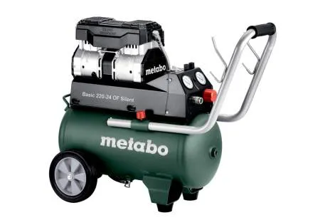 Metabo Basic 220-24 OF Silent on erittäin hiljainen kompressori, joka soveltuu erinomaisesti työpajoihin, remontteihin ja meluherkkiin ympäristöihin. Öljytön kaksisylinterinen rakenne tekee siitä huoltovapaan, ja suuret pyörät sekä VarioGrip-kahva helpottavat siirtämistä.